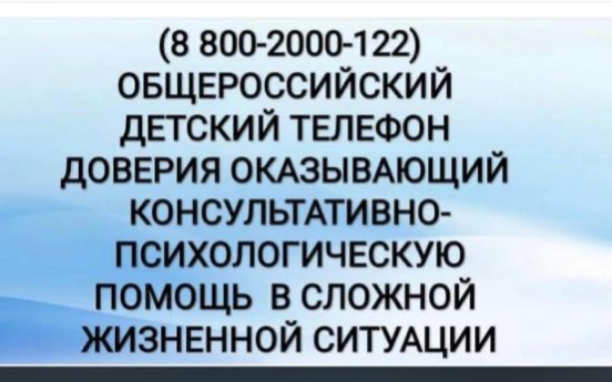 Общероссийский детский телефон доверия оказывающий консультативно-психологическую помощь в сложной жизненной ситуации.